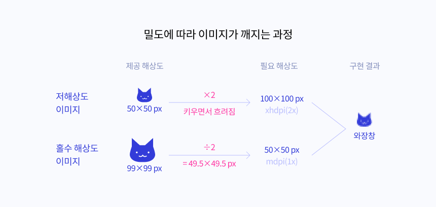 1dp에 4px을 요구하는 디스플레이에 2px의 이미지를 제공하면 2px을 4px 영역에 채우기 위해 시스템이 늘리기 때문이다.